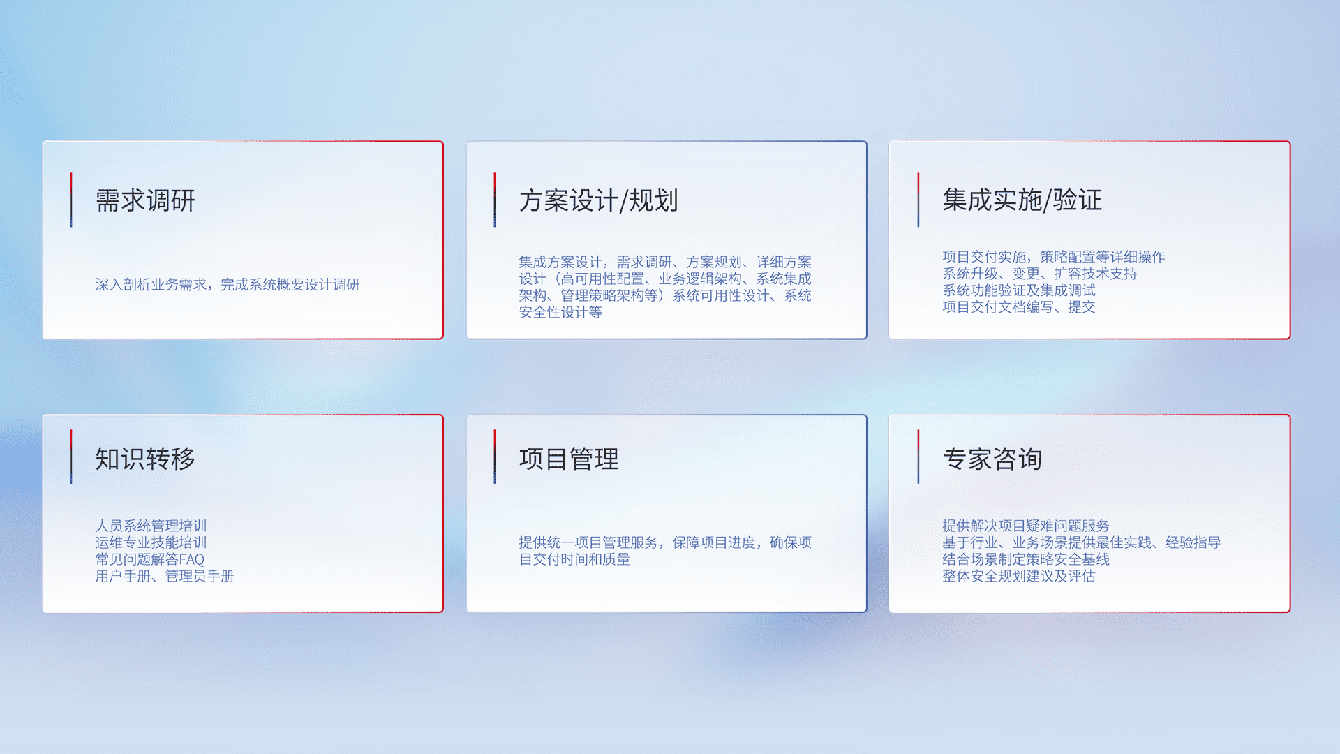 针对客户行业特性,,将宏观的安全战略和需求,,,,通过专业的交付服务,,实现项目落地,,,为客户提供标准规范的集成交付服务。。。